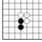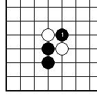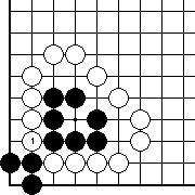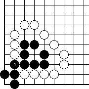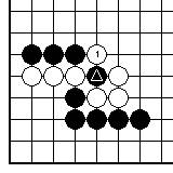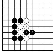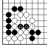 Yet another example is seen in Diagram 4-11. When white captures the two black triangle stones with 1, the interior and exterior white groups are now merged as one and now white is in an advantageous position.