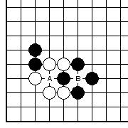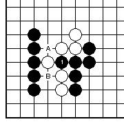 See Diagram 4-8, and it is rather obvious that white can connect his stones at 1 if is his turn to play. But now it is black’s turn, so black will squeeze at 1, causing white to have two points for cutting at A and B. Unfortunately, white cannot connect at A and B during a turn: if white plays at A, then black plays at B; if white plays at B, then black plays at A. In any case, the two white stones at the bottom is disconnected.