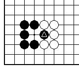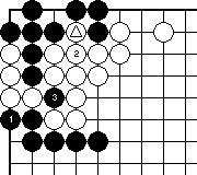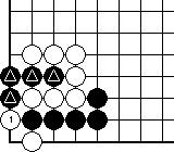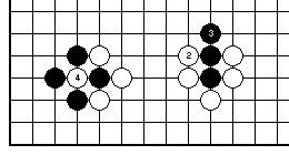 An example of a ko tipped in favour in one player is shown in Diagram 5-8. White 1 starts a ko, and if black loses this ko, black loses the four triangle stones as well. If white loses this ko he has nothing to lose. Hence this ko is advantageous to white, and is also referred as a picnic ko. Diagram 5-3 and Diagram 5-4 are also examples of picnic ko.