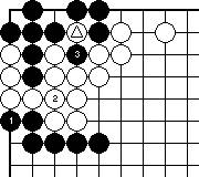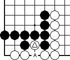Diagram 5-4 shows a ko that threatens white’s connection. If white wins this ko then he connects at A to save the two corner stones. If black manages to take the ko at A and then connect at the position of the triangle white stone then he would capture the two corner stones.