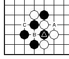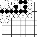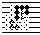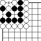 A three move approach ko is shown in Diagram 5-14. In this diagram white has to play at A and B before the ko is turned into a direct ko fight. We can also say that this ko is in favour for black.