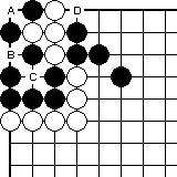 Diagram 5-12 shows an example of a two stage ko for white. In order to win this ko, white has to win the ko at A, followed by the ko at B, before taking all the black stones at C. If black wins this direct ko fight, he would take the four white stones at D.