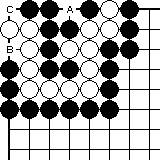 Diagram 5-3 shows a black group in the corner whose life and death is threatened by a ko. If black wins this ko then he wound certainly connect at A. If white wins this ko white wound occupy both A and B (remove three black stones from the board) to kill black.