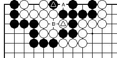 Diagram 5-15 shows a double ko indicated by the triangle stones. Assuming black first, he takes the ko at A, causing an atari of the white group and forcing white to take the ko at B. Then the result is Diagram 5-16. Now black still want to capture white – he finds a ko threat, then takes the ko at B. But white can now take back the ko at A, and the result reverts back to Diagram 5-15. Suppose white starts off in Diagram 15-5 and tries to capture black, then the result is still the same. Ruling: since neither black nor white can capture the other group, this condition is treated as a seki.