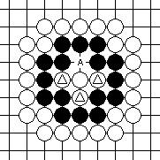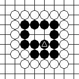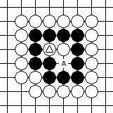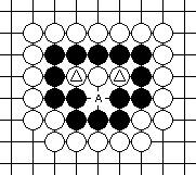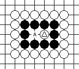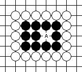 Diagram 6-1 shows a two-space eye. Is it one eye or two eyes? However, unlike a group with two eyes, it is legal for white to play the triangle stone (known as the placement) in Diagram 6-2. Assuming that the group is surrounded without outside liberties as shown in Diagram 6-2, white can play at A during the next turn to remove all the black stones from the board. But if black plays at A, the result is Diagram 6-3, which is clearly only one eye, and white can play at A to capture all the black stones. So we go back to the question related to Diagram 6-1: the two-space eye is only one eye. Verdict: when surrounded, the two-space eye is a dead group.