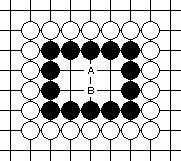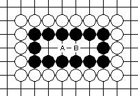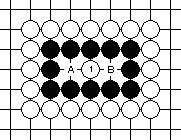 The black group in Diagram 6-16 is a straight four, which is always a living group. Even when surrounded, it is impossible for white to play both A and B on a turn. Look at Diagram 6-17. When white plays at 1, black plays at 2, and we see black has two eyes. If white 1 is played at 2, then black plays at 1, and the result is still the same. However, if white is allowed to play at both 1 and 2, then black dies from a straight three.