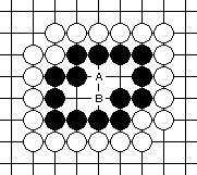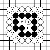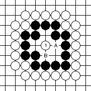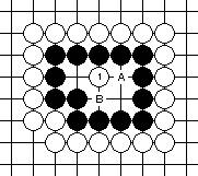 We start off this section with the bulky five, shown in Diagram 6-20. Like most of the other types of multiple-space eyes, if white first then black dies, if black first then black lives. The vital point is at 1. After white plays at 1, if black plays at A, then white plays at B; and vice versa, if black plays at B, then white plays at A. For the case if black chooses not to play anything, white can play the triangle stones in Diagram 6-21 to force an atari, forcing black to remove the four white stones from the board, and reducing the black eye into the dead squared four eye. (Alternatively, white can also reduce black into the dead pyramid four eye.)