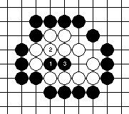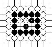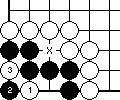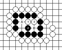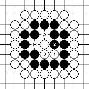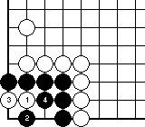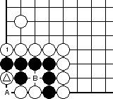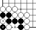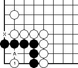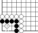 Diagram 6-29 shows a bent four in the corner, and black has no exterior liberties. When white plays at 1, black must play at A in order to survive. However, as black does so in Diagram 6-30, white can play at 3 to take black 2 off the board. The survival of the whole group will now depend on the outcome of this ko: if white wins this ko, white will play at A to capture the black group; if black wins this ko, black will play at A and makes two eyes.
