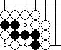 This time we give the white group an exterior liberty in Diagram 6-31, shown as X. White will play as usual in the sequence from 1 to 3, resulting in Diagram 6-32. We see that black can’t play at A, as white can take all the black stones off the board by playing at B. So black will still need to fight the ko at C. If white wins the ko he connects at C and black dies from a bent three. If black wins then he will occupy both C and A and makes two eyes.
