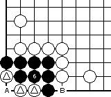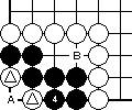 The next type, bent three is shown in Diagram 6-7, where the vital point for both players is at first. Like straight three, if black plays first black lives; if white plays first black dies. Suppose black plays at either A or B, black will be dead with a two-space eye. Hence, white can play the triangle stone in Diagram 6-8, putting black in atari, forcing black to play at A, resulting in Diagram 6-9 (a dead two-space eye).