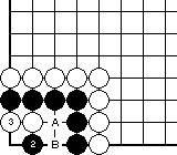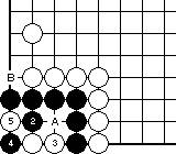 Assuming now we have a bent four in the corner with two exterior liberties, indicated as X in Diagram 6-33. And we suppose that white still plays at 1 and 3 as before. Now we look at Diagram 6-34: black can now play at 4 and capture the two triangle stones. This time round white can’t connect at A: this is suicide. So when white ataris the black group at B, black will play at A to form two eyes.
