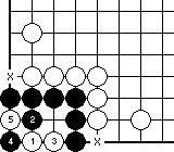 Diagram 6-37 shows the case where black has one liberty at X. This time round white should play at 1 instead of A. Black should answer white 1 with A, but what happens? See Diagram 6-38. White will play at 3, forcing black to play at 4, and then white 5 takes a ko. Notice that like the bent four in the corner, black is short on liberties and therefore cannot play at A. If black wins this ko, he will live by taking the white stones at A.