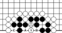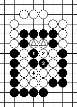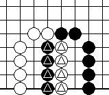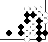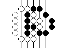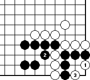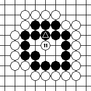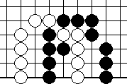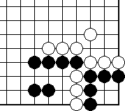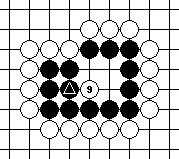 We shall begin with Diagram 10-14, where both parties have three liberties each. It seems that the party that plays first will win the capturing race.