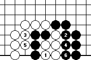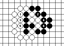 We can see that even if it is white’s turn, and he starts reducing the liberties of the five black stones in Diagram 10-5. However, black 4 already ataris the white group, and by the time white 5 reduces the black group to one liberty, black 6 sends the four white stones off the board. From this we can deduce that even if white plays first in Diagram 10-4, black will still win the capturing race. In short, the white group is effectively dead and white can (and should) actually play elsewhere.
