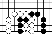 In capturing races, it is very often for both groups to have liberties in common. We call them common liberties, otherwise also known as shared liberties. Diagram 10-6 illustrates an example, where the common liberty is marked X. They have an equal number of outer liberties, three each. The question is: white first, how to win the capturing race?