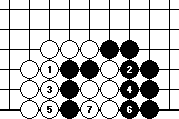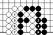 The correct way of filling up liberties is shown in Diagram 10-7. White starts filling up liberties outside, and finally fills up the common liberty at 7, and wins the capturing race. If white 1 fills up the common liberty instead, Diagram 10-8 results. Now both groups have three liberties each, and it is black’s turn, so black wins the capturing race.