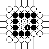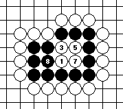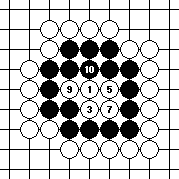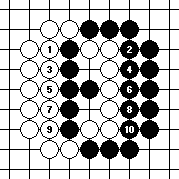 Suppose white plays first. By reducing the liberties one by one in Diagram 10-2, white will capture black at 7. Diagram 10-3 shows what happens if black plays first. In this case, black fills up all the liberties before white and wins the capturing race.