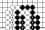 In a similar fashion, we can argue that a five-space eye has eight liberties. In Diagram 10-23 and Diagram 10-24, we see that white 7 forces black 8 to remove four stones from the board. White has reduced four black liberties of black by playing at 1, 3, 5 and 9, and now black has four liberties left (a four-space eye with one less liberty). Summing them up we have a total of eight liberties.