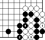 We have already encountered one such case back in section 10.4. We take a good look at Diagram 10-15, and we realize that white can’t play at 3 to fill up black’s liberty as white will put himself under atari. We can say that white is caught with a shortage of liberties.