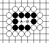 It has two liberties at A and B, nothing really special. When white fills up the liberty at A, black should never play at B to remove the stone at A, resulting in Diagram 10-17, in which white can make an immediate capture of the black group. In analyzing the difference, we find that when black plays at B, this move is not used to reduce white’s liberties during the capturing race, and instead it is used as a response as white A. Thus, the effect of black playing at B is to reduce its own liberties by one.
