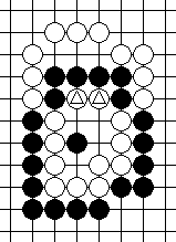 The process of counting liberties is much like the ritual we did in Lesson 6 when we proved why certain types of multiple-space eyes are considered dead, and we shall begin with the two-space eye in Diagram 10-16.